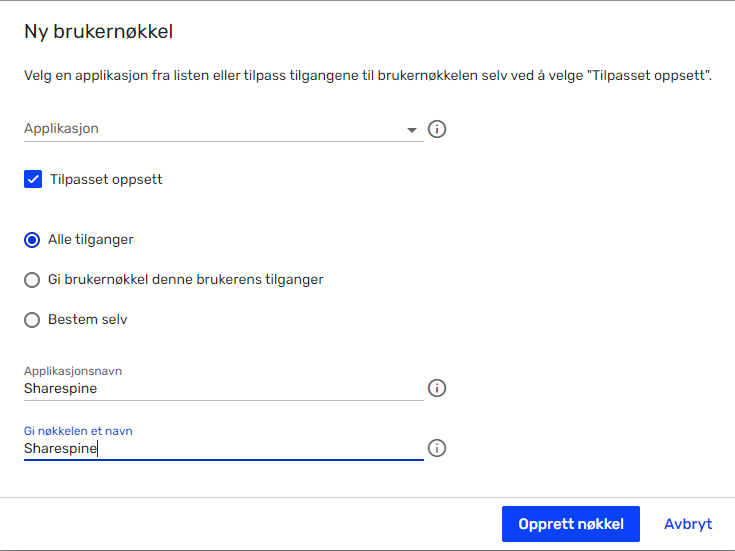 - Set up the new key as shown in the image below. It's important that "Application Name" is set to Sharespine. Then press "Create key" Show screenshot ↗