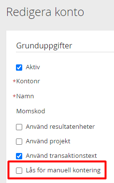 Konton i Visma eEkonomi som är låsta för manuell kontering kan inte användas av appen.