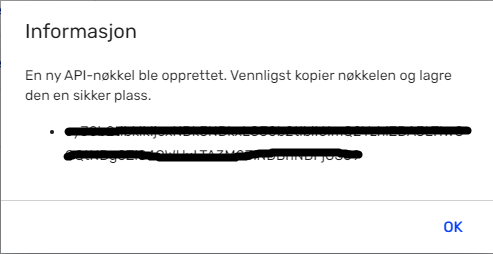 - Nu visas den skapade nyckeln i ett nytt fönster. Kopiera nyckeln innan du trycker OK eftersom den bara visas en gång. Annars måste du skapa en ny nyckel. Visa skärmbild ↗