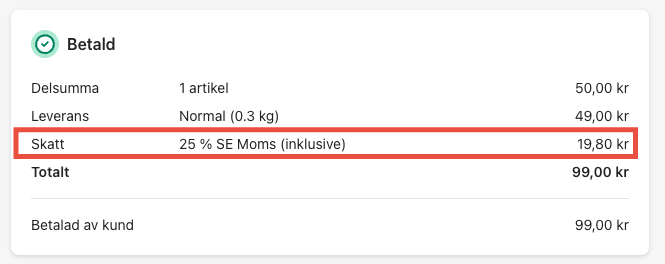 Men om du anger ditt momsnummer i Shopify under "Skatter och tullar", kommer ordern att vara korrekt baserad på var kunden och leveransen är belägen, oavsett om det är i Sverige, inom EU eller utanför EU.