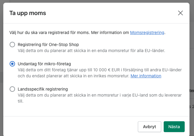 Om du som företag är momsregistrerad och har passerat gränsen för när du har rätt att debitera moms till dina kunder, måste du ange detta i Shopifys admin.