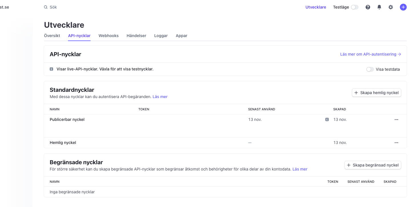 För att koppla upp dig mot Stripe behöver du först skapa en Secret key. Gör det genom att följa nedan steg.