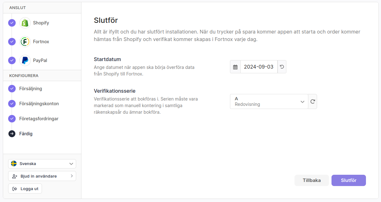 Nedan är exempel på ett kundkonto som har Shopify (orderkälla och avstämning) och PayPal (avstämning) anslutet mot Fortnox (bokföring). Guiden presenterar pedagogiskt steg-för-steg så användaren får kontot konfigurerat och driftsatt med automatiserad bokföring. Slutkunden ser alltså endast det som är ytterst rtelevant att ta del av för att göra processen så tydlig och enkel som möjligt.