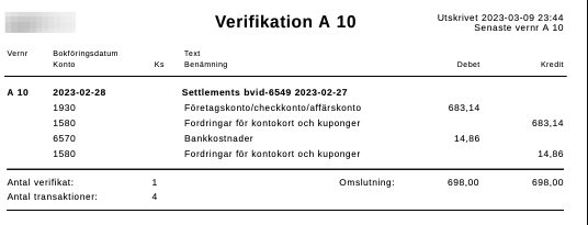 När sedan utbetalningen eller avräkningsnotan kommer från betalningsleverantören så bokförs detta i ett verifikat. Verifikatet dateras till det datumet utbetalningen skett och underlaget delas upp per utbetalning till bank, avgifter och eventuell moms på avgiften.