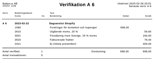 Varje dag sammanställer integrationen försäljningen och krediteringar till ett eller flera verifikat konterat enligt önskemål. Denna verifikationen skickas sedan vidare till ekonomi- och affärssystemet för bokföring. Per standard så skapas verifikatet först när försäljningen är betald. Underlaget delas upp per momssats, betalsätt, presentkort och t.ex. dricks beroende på vilken information försäljningskanalen stödjer. Till underlaget så tillkommer en bilaga över vilken försäljning som ingick i verifikatet för spårbarhet bakåt i kedjan.