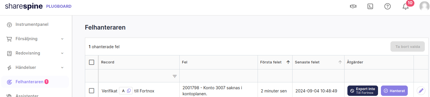 Åtgärden blir här är att kontrollera i Fortnox om kontot finns och även att det är Aktivt. När detta är genomfört kan man klicka på Hanterad. Sedan kommer verifikatet att skapas upp i Fortnox vid nästa dataöverföring.