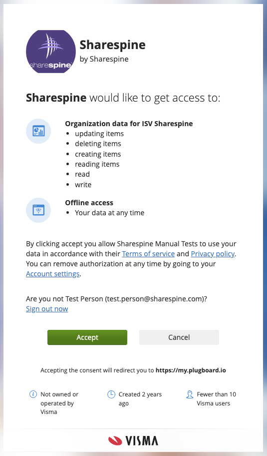 Väl inloggad väljer du vilket Visma.net-företag du vill ansluta och i nästa steg visas vilka rättigheter du ger integrationen. Klicka på "Accept" så skickas till tillbaka till integrationsflödet. Visa skärmbild ↗